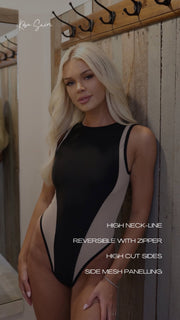 Indulge in the sophisticated charm of this stunning one-piece swimsuit, designed to elevate your beachside ensemble with its polished details. The high-neckline and one-piece high cut offers a timeless allure, while the zipper enhances the modern appeal. Inspired by the elegance of a muse, the side sheer mesh paneling not only adds a touch of chic but also provides breathability & ventilation to keep you cool and comfortable.